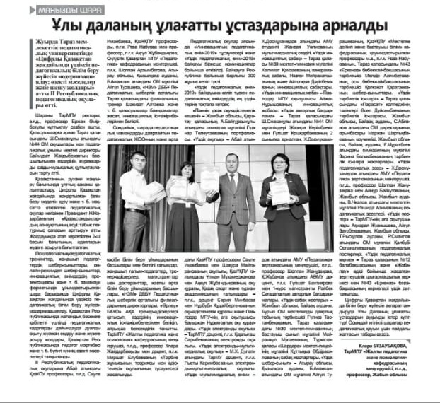 On 24th and 25th of January, 2019 II Republican pedagogical readings on the theme “Modernization of the system of pedagogical education in the conditions of digital Kazakhstan: actual problems and ways to solve them” were held in Taraz State Pedagogical University. Within the framework of the II Republican Pedagogical Readings, a competition was held among the country's higher education institutions for the “Best Teaching and Methodological Complex of the Discipline (Best Portfolio)”, “The Best Textbook (study guide)”, “The Best e-Learning Book”, etc. More than 300 works of teachers-innovators, teachers, doctoral students, scientists from different universities of Kazakhstan participated in the competition.