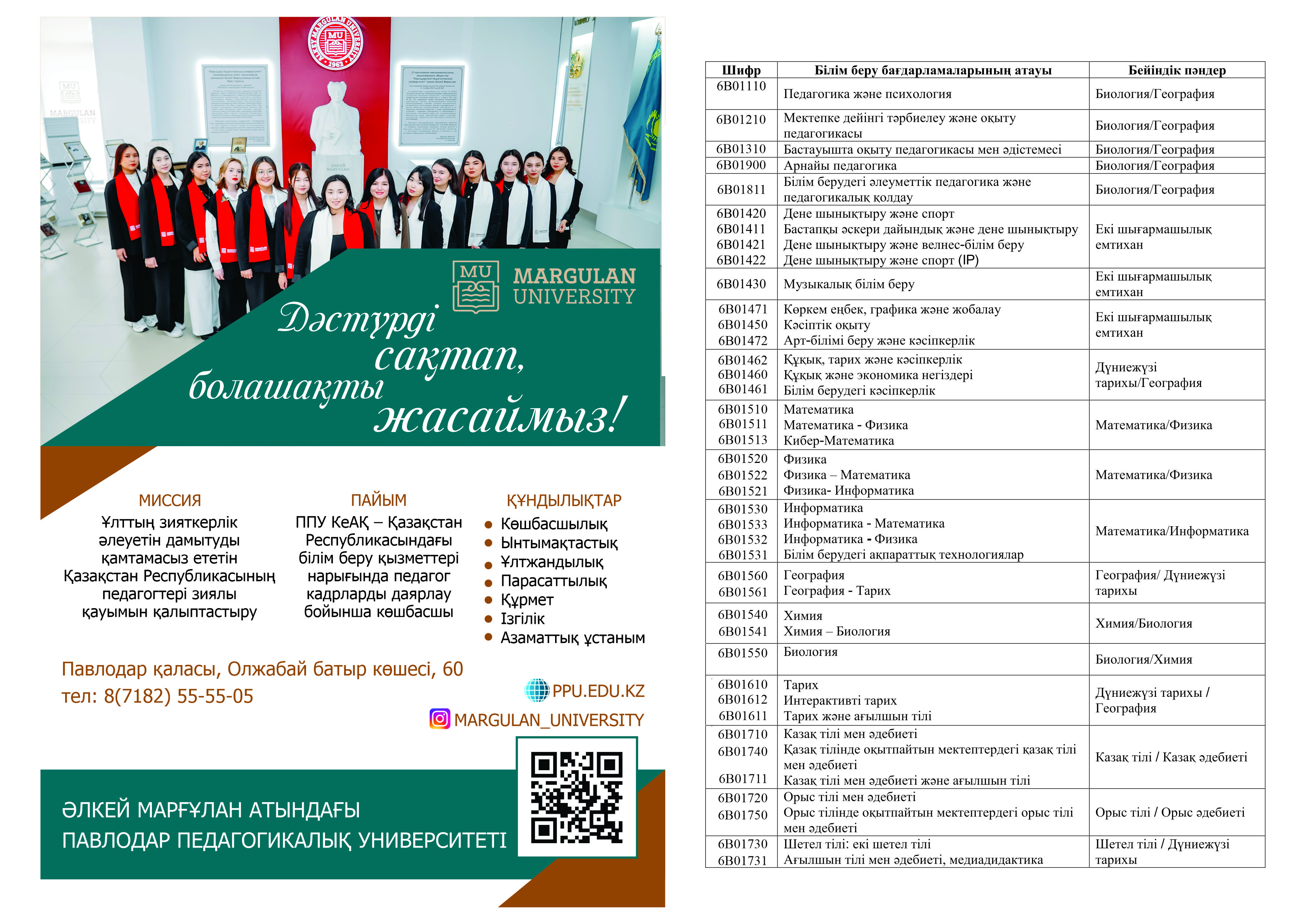 Әлкей Марғұлан атындағы Павлодар педагогикалық университетінің Өнер және спорт жоғары мектебінің «Құқық тарих және кәсіпкерлік» білім бағдарламасының оқытушылары Павлодар облысының Шарбақты, Ақтоғай, және Баянауыл аудандарында, сонымен қатар Шығыс Қазақстан облысының Зайсан ауданында кәсіби бағдар жұмысын жүргізді.
