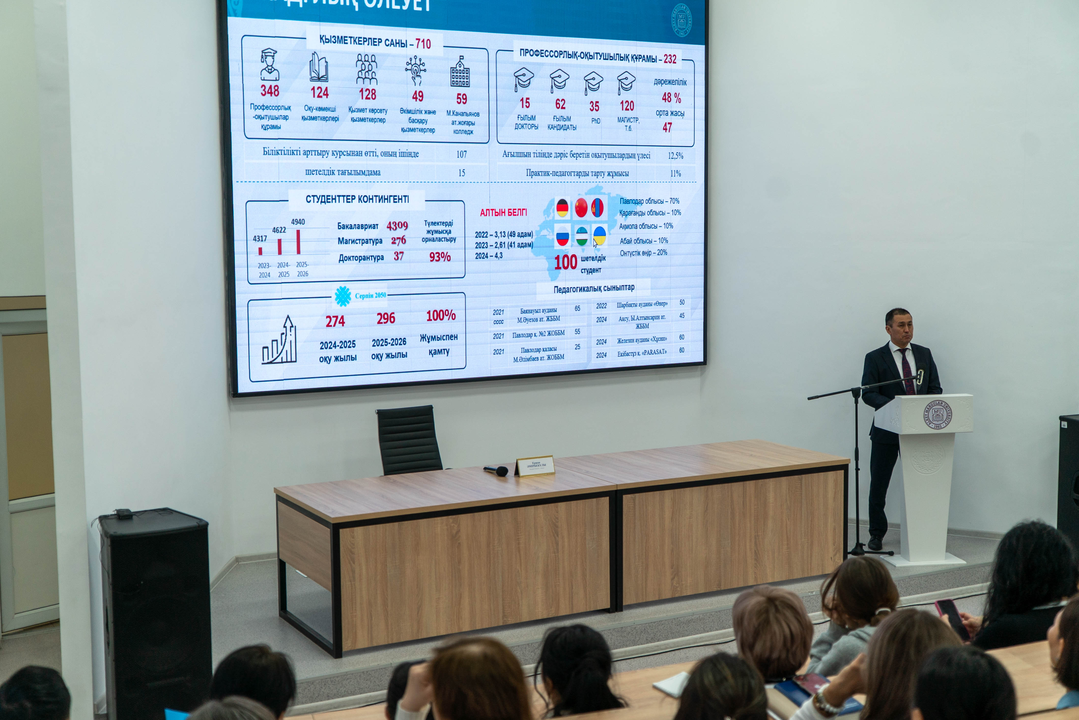 Жиын барысында ректор университеттің оқу үдерісін жаңғырту, ғылыми-зерттеу әлеуетін арттыру, халықаралық серіктестіктерді кеңейту, білім сапасын күшейту және инфрақұрылымды дамыту бағыттарында жасалған негізгі жұмыстарға тоқталды. Сонымен бірге жаңа білім бағдарламаларының ашылуы, студенттердің жетістіктері, академиялық ұтқырлық көрсеткіштері, цифровизация процесі және әлеуметтік қолдау шаралары жөнінде баяндама жасады.