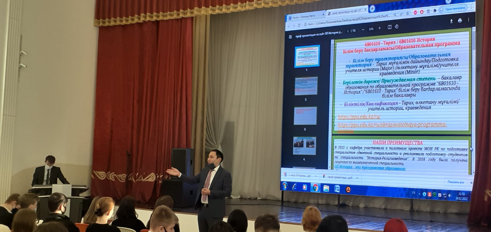 2022 жылдың 24 ақпанында Павлодар педагогикалық университетінің Гуманитарлық ғылымдар Жоғары мектебінің доценті Н.Е. Күзембаев Павлодар қаласының № 8 дарынды балаларға арналған мектеп-лицейінде жоғары сыныптар үшін кәсіптік бағдар беру іс-шарасын өткізді. Іс-шараға лицейдің сынып жетекшілері мен лицей басшылығы қатысты. Өз сөзінде доцент педагогикалық университетке және "Тарих" білім беру бағдарламасына түсудің артықшылықтары туралы айтты. Кәсіптік бағдар беру әңгімесінен кейін риторика және шешендік өнердің табысты мансап үшін маңыздылығы туралы дәріс өтті.