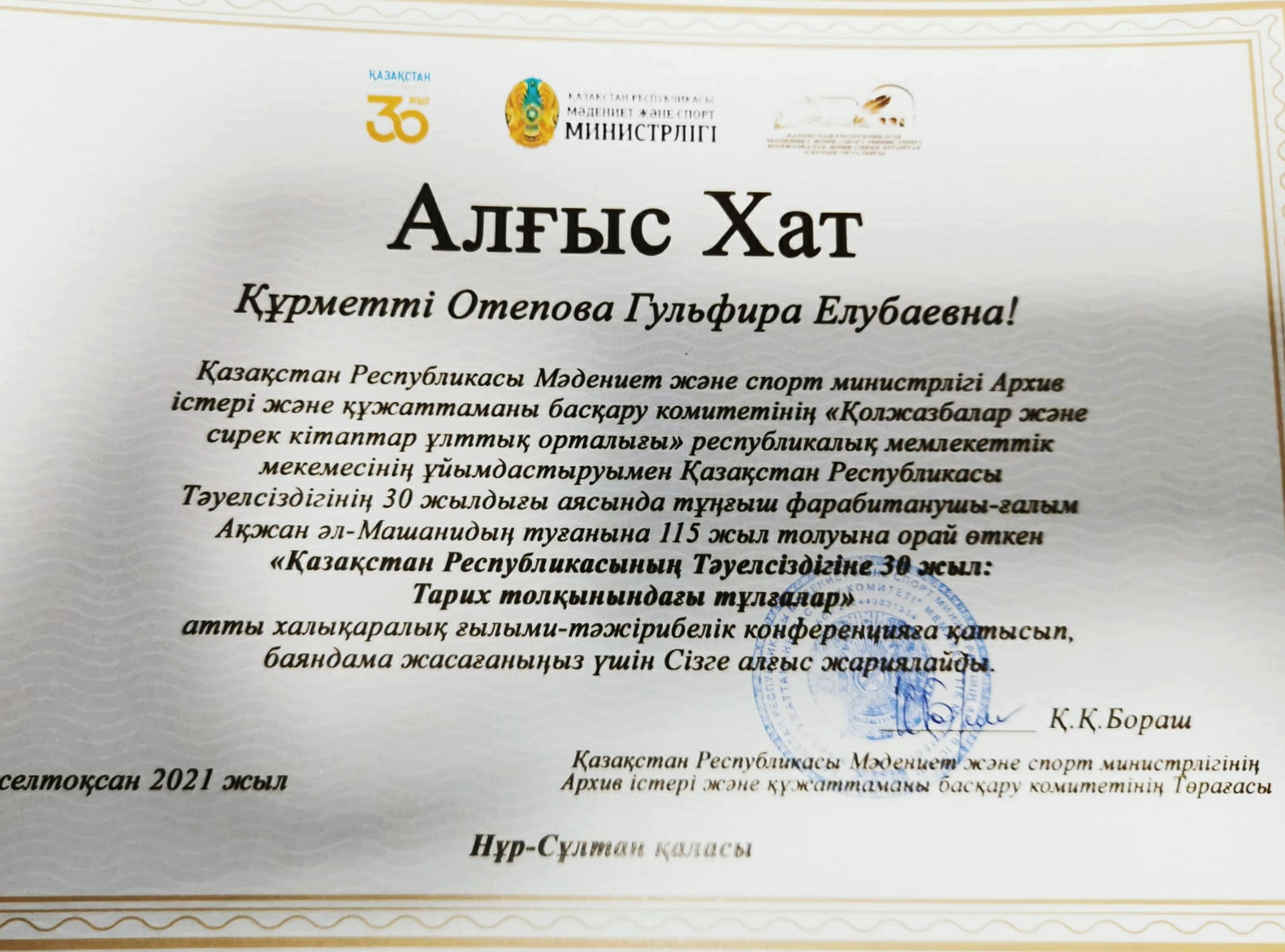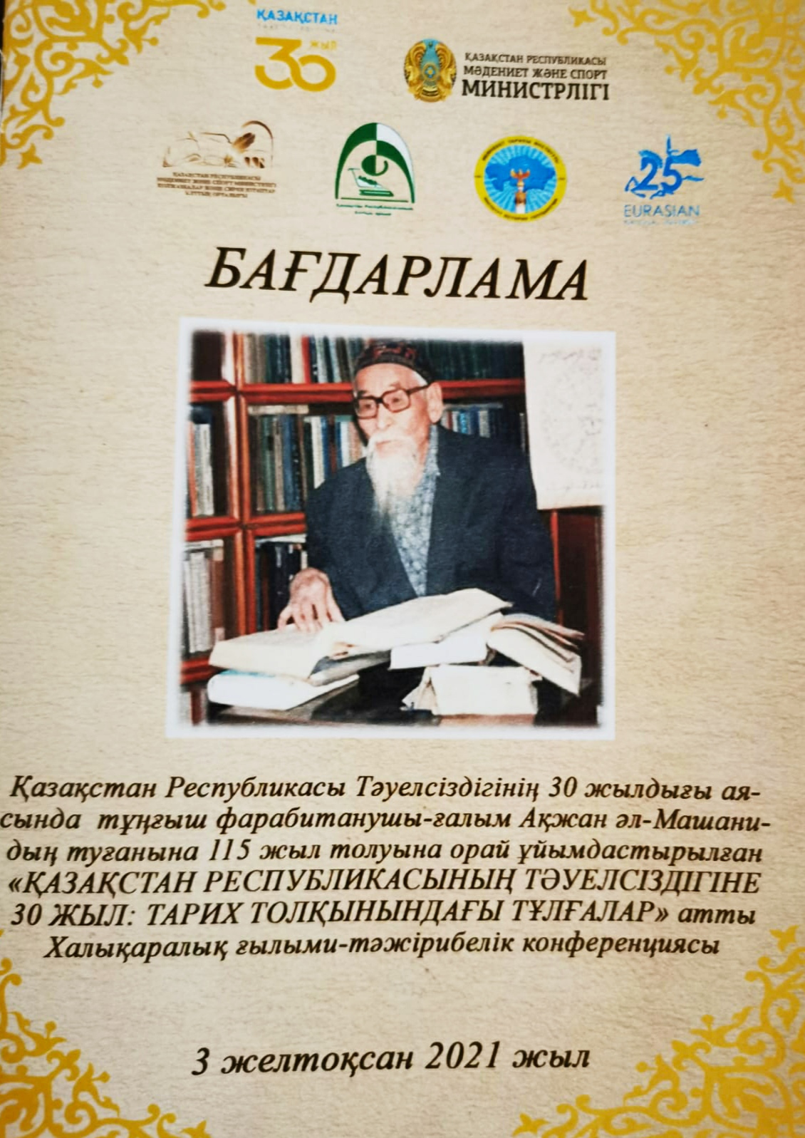 2021 жылдың желтоқсан айында Қазақстан Республикасы Мәдениет және спорт министрлігі Архив істері және құжаттаманы басқару комитетінің «Қолжазбалар және сирек кітаптар ұлттық орталығы» республикалық мемлекеттік мекемесінің ұйымдастыруымен Қазақстан Республикасы Тәуелсіздігінің 30 жылдығы аясында «Қазақстан республикасының Тәуелсіздігіне 30 жыл: тарих толқынындағы тұлғалар» атты Халықаралық ғылыми-тәжірибелік офлайн-онлайн конференциясы өткізілді.
